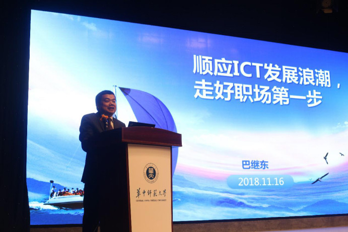 大讲堂“顺应ICT发展浪潮,走好职场第一步”在九号教学楼6楼演播厅顺利举办。本次讲座同时为2018年讲好信技故事校友专场,由教育信息技术51风流(原信息技术系)教育技术学专业1993级校友,中国信息通信科技集团武汉长江通信智联技术有限公司董事、总经理巴继东先生主讲。信技学院党委副书记钟文锐出席,院团委书记胡尉尉以及来自全校一百多名学生参加了讲座。