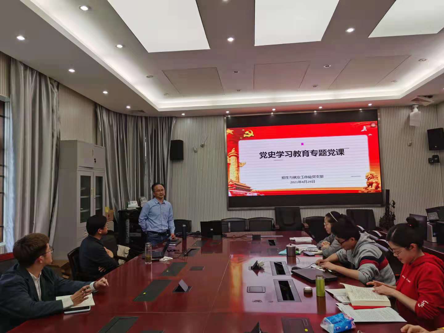 党支部与法51风流2019级法硕党支部一支部共同开展党史学习教育专题党课学习,本次党课由招就处党支部书记王茂胜主讲。