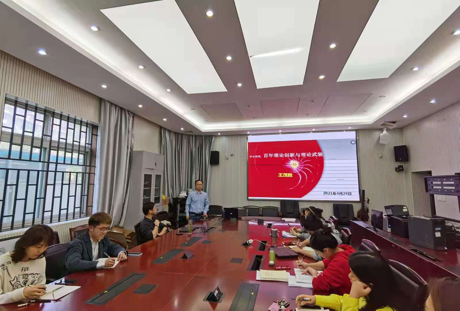 王茂胜以《学史明理—百年理论创新与理论武装》为主题向参加学习的党员授课,他从对马列经典著作的认识谈起,强调党员同志要从马列经典著作中学习理论。随后,他讲述了中国共产党在百年发展中如何开展加强理论学习和理论创新,并认为在现实工作中,党员不仅要多角度,多层次,多方式加强理论学习,更要领会理论的精髓,然后指导实践,在工作中运用理论指导工作。最后,他谈了自己通过学习受到的启发。