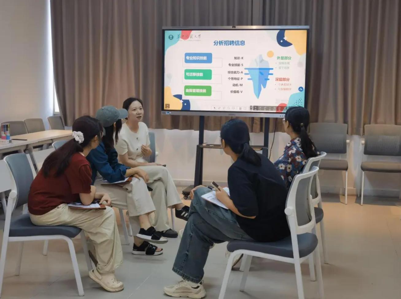 处生涯主管卢雯带领同学们通过一系列活动搜集求职信息,分析岗位核心能力要求。