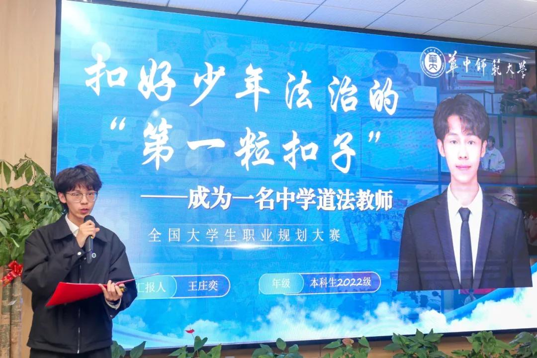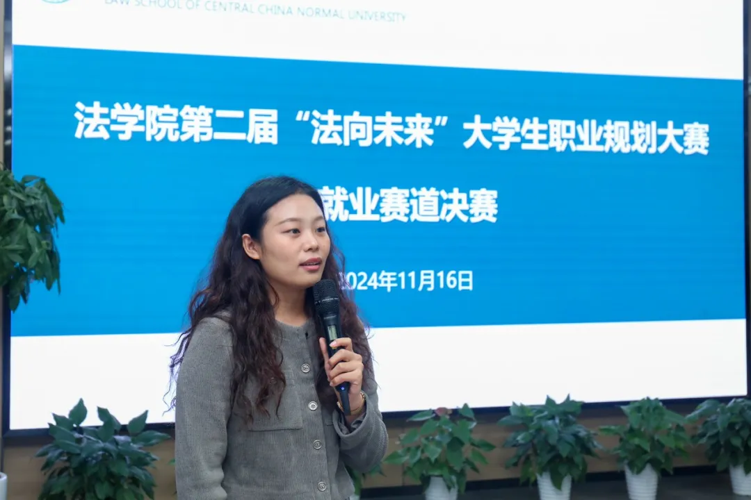 赛道中,9名选手围绕职业胜任力与职业目标匹配度进行展示。张龙、王庄奕、龙媛媛致力于法治教育,分别聚焦西部法治教育、道法课程教学创新,强调教学实践与青少年法治教育发展的关联。肖博涵、罗晓慧、黄龙宇致力于成为乡村振兴律师、乡村妇女权益保护公职律师和检察官助理。邹蕴以企业法务为职业目标,结合实习经历阐述了在合同审查、风险控制等实务方面的能力和跨学科背景的优势。赵新毅和崔芃凡则专注于高校人才培养,分别以高校教师和辅导员为职业方向。